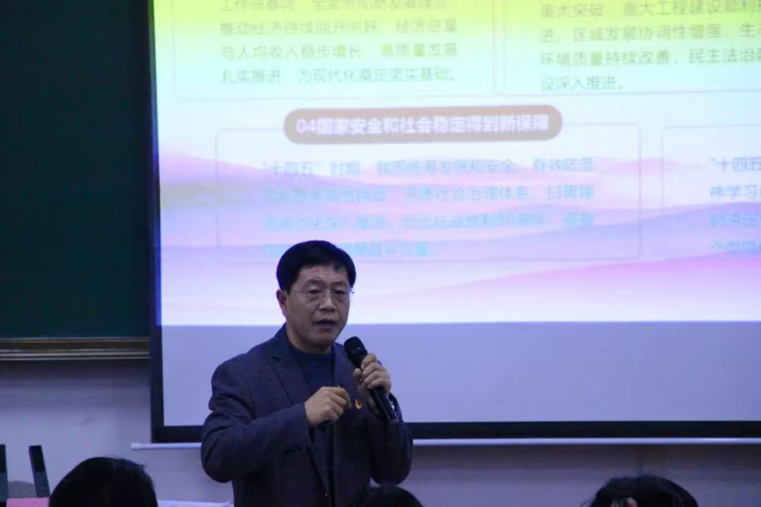 庞更新首先围绕宣讲主题,聚焦学习贯彻习近平总书记在党的二十届四中全会上的重要讲话精神以及全会审议通过的《中共中央关于制定国民经济和社会发展第十五个五年规划的建议》,从深入领会全会召开的时代背景与重大意义,准确把握“十四五”以来我国发展取得的重大成就和“十五五”时期在基本实现社会主义现代化进程中的重要地位,科学认识“十五五”时期我国发展面临深刻复杂变化,全面理解“十五五”时期经济社会发展的指导思想、重大原则、主要目标、战略任务、重大举措、根本保证等方面,对全会精神进行了系统深入的宣讲解读。他强调,全校师生要深刻领悟“两个确立”的决定性意义,树牢“四个意识”,坚定“四个自信”,坚决做到“两个维护”,始终在思想上政治上行动上同以习近平同志为核心的党中央保持高度一致。