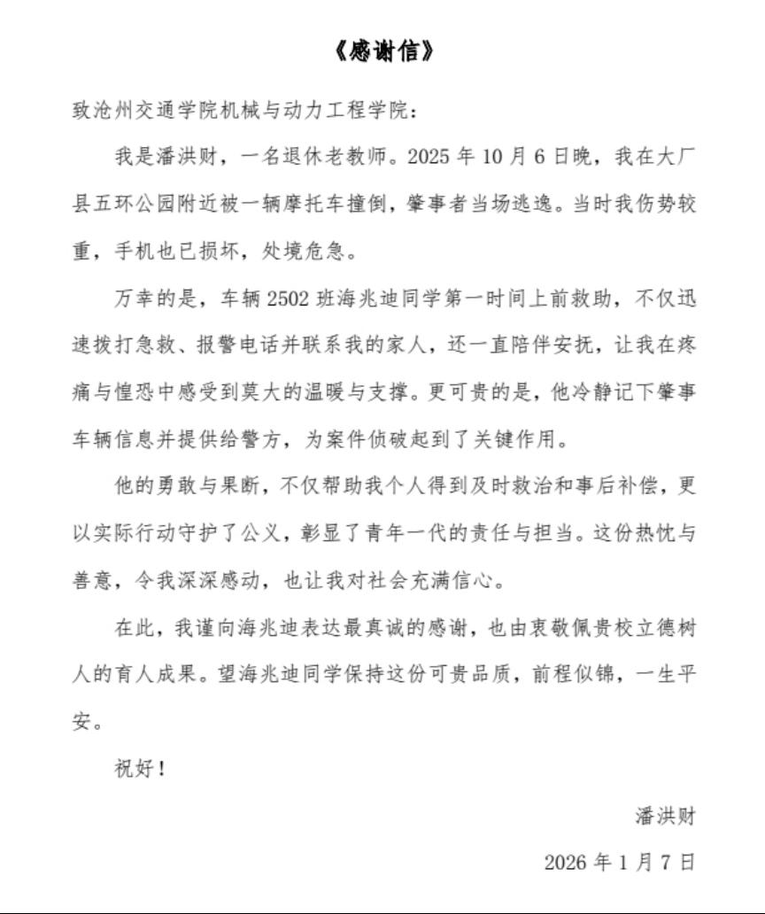 2026年1月8日,sunbet官网收到一封真挚的感谢信。信中高度赞扬了sunbet官网机械与动力工程学院车辆工程专业2502班海兆迪同学见义勇为、热心救助受伤老人的善举。这封信不仅传递着受助者家属的深切谢意,也映照出sunbet官网学子扎根日常、勇于担当的青春风采。
