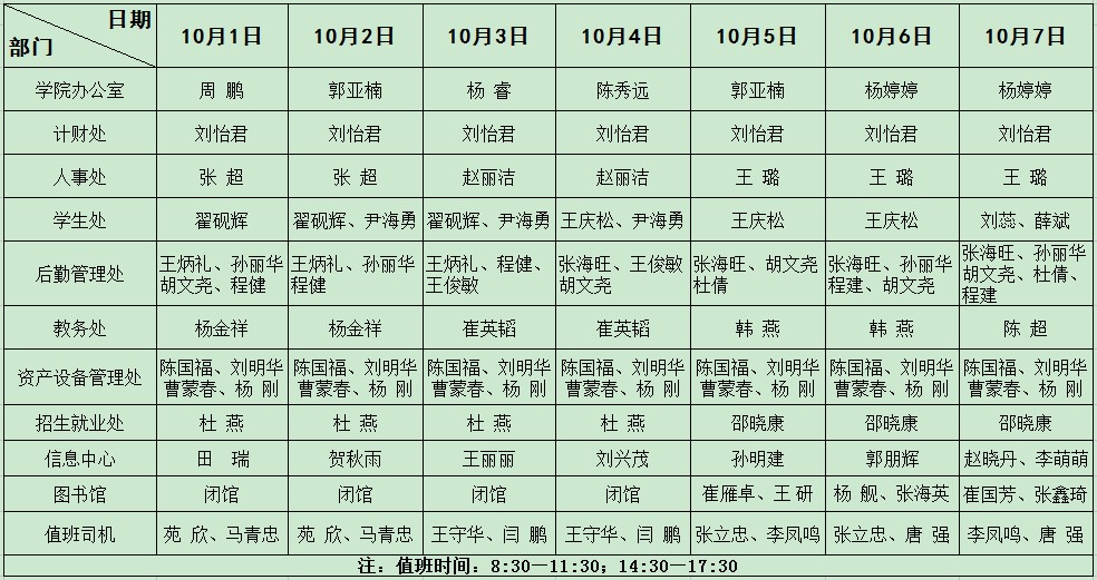 北京交通大学海滨学院行政值班表(10月)