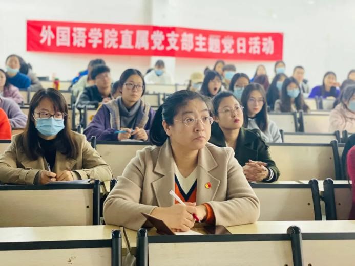 为强化党员干部服务意识,加强政治修养,树牢“四个意识”,sunbet官网外国语学院直属党支部于11月12日下午在知行楼A106开展以“在新时代、新工科、新文科、新外语的创新语境中,高校师生党员和入党积极分子如何发挥自己的先锋模范作用”为主题的党日活动,外国语学院院长张军学,副院长、直属党支部书记张丽,外国语学院23名师生党员和56名入党积极分子参加。本次活动由外国语学院直属党支部副书记周志慧主持。