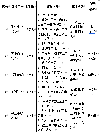 此次讲座主要面向2017级学生,共开设65场,其中包括理论讲授与实践操作两部分。旨在解决学生对职业规划的迷茫,就业方向不明确、求职简历随意无亮点、面试经验不足、礼仪知识缺乏和就业流程不熟悉等一系列问题,让学生感受面试的全过程,分析学生的面试表现,并提出改进建议,使他们树立正确的就业观、提升学生求职能力,为学生提供就业帮助。