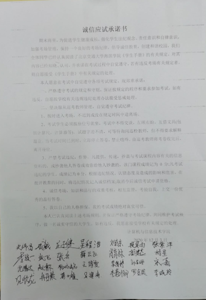 此外,计算机与信息技术学院各年级辅导员老师还组织广大同学签署诚信考试承诺书,引导广大同学端正考试态度,严格遵守考试规章制度,用严谨的考试作风、严明的考试纪律和良好的考试心态迎接期末考试的到来。