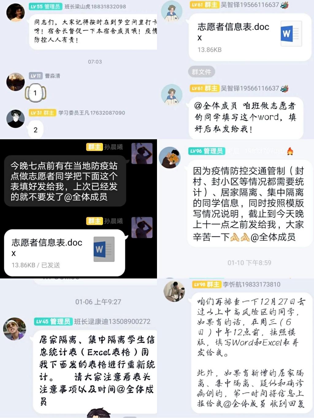 造价1904班学生邢宇辰,负责在社区为居民分发物资,维持核酸检测秩序,记录检测信息等工作;土木2003班学生东毅飞帮助医生登记已做核酸检测人员名单;造价2002班学生刘诗雨志愿担任登记工作,负责填写村民的姓名、身份证号和电话号码等工作。他们挺身而出、驰援社区,携手战疫,投身家乡抗疫志愿工作。