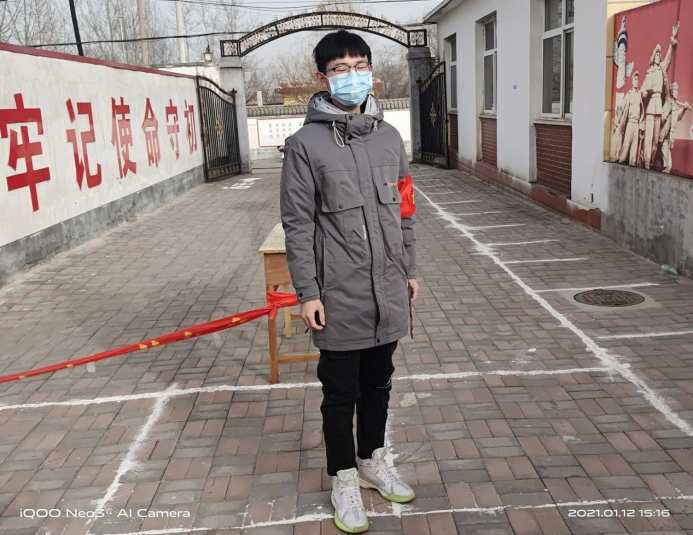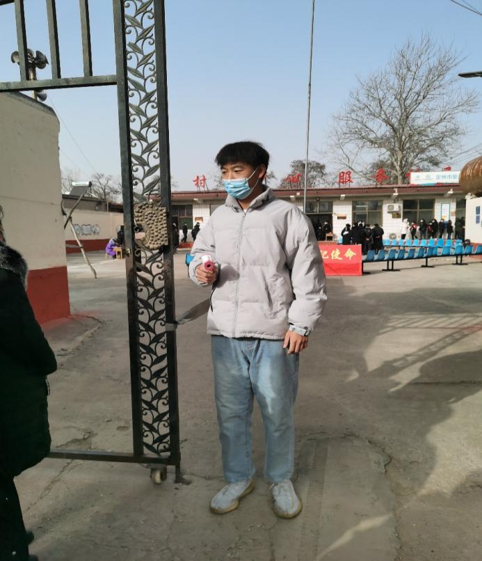坚守平凡岗位,留下最美身影。物联网工程2002班学生程文杰经过紧张而有序的培训后,火速投入到志愿服务工作,他在寒风中测量体温、登记信息、卡点执勤,尽职尽责,坚定地站在疫情防控工作的第一线,发挥着自己的光和热,配合村两委守护着人民群众的健康安全,成为特殊时期—道最美的风景。