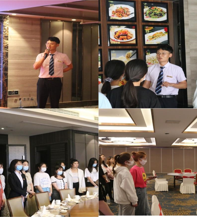 首先,由酒店各部门经理带领学生分批次参观酒店包厢、宴会厅和客房等区域;其次,观摩了酒店的前台入住办理、包厢摆台、餐厅走菜等环节;随后师生在三楼婚宴厅集合,销售部杜经理讲解了威尔士酒店的整体情况、员工的服务礼仪以及薪酬待遇等内容;最后,总经理助理于经理从自己的工作经历与体会出发,与同学们交流了酒店业未来发展趋势、酒店人职业发展前景等问题。