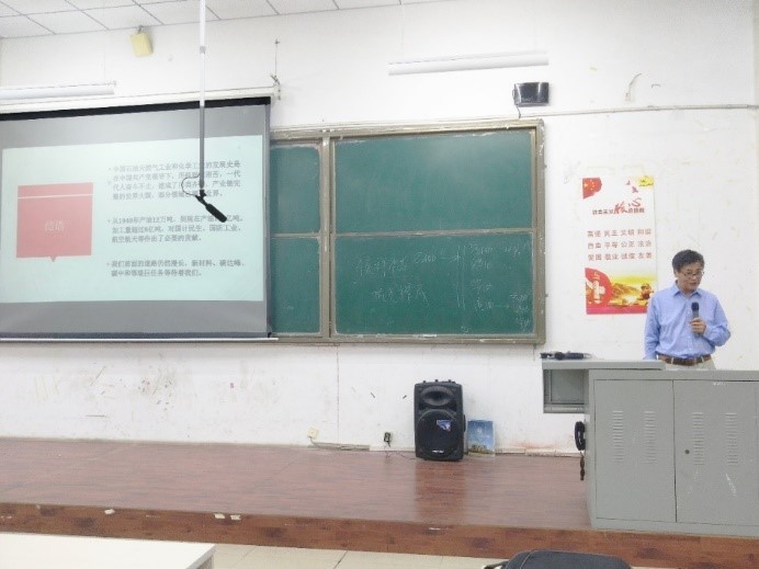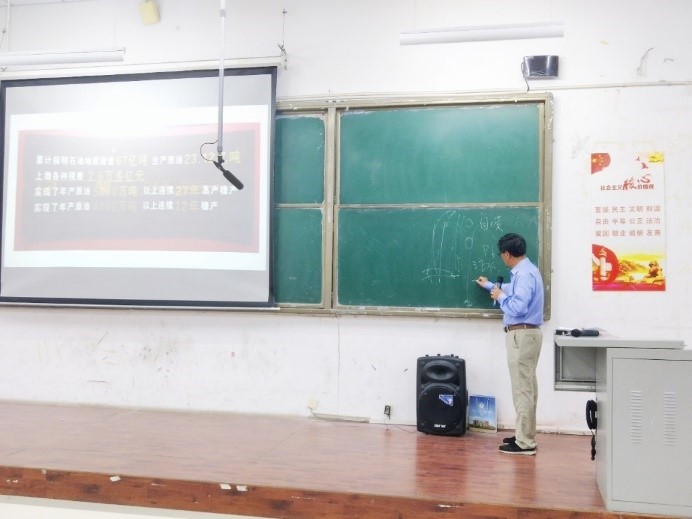 本次讲座共分为我国石油和化学工业的历史、新中国成立开启我国工业化新征程、改革开放推进建设石油和化工大国、新时代向石油和化工强国进军四个部分。侯老师用生动的语言向同学们讲解了新中国成立后,在中国共产党的领导下我国石油事业蓬勃发展的新局面,并在黑板上生动形象地绘画了石油炼制原理,深度剖析了石油的成分。侯老师还向我们介绍在这个时期,国家对石油工业做出的重大决策——海洋石油对外开放,海上大陆成为中国第一个对外开放的“特区”,以及党的十八大以来石油和化学工业的发展战略。