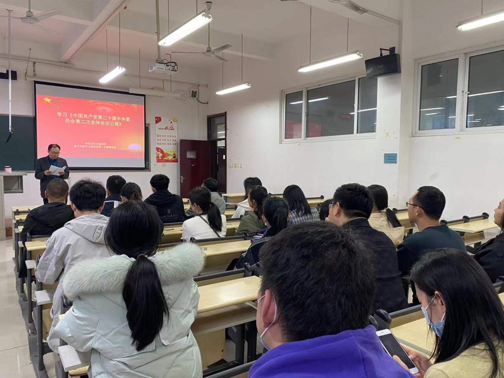 4月1日,sunbet官网电子与电气工程学院第二党支部于知行C106召开全体党员大会,组织学生党员集中学习党的二十届二中全会精神。会议由电子与电气工程学院第二党支部书记李艳梅主持,全体学生党员参会。