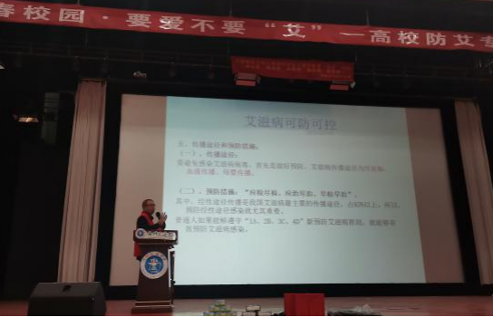 李洪峰从当前艾滋病感染的现状出发,结合长期的工作经验和案例分析,通过知识点讲解、PPT展示的形式向同学们详细介绍艾滋病的危害性、青少年应如何防控艾滋病以及开展防治宣传教育的意义,并结合一些病例,重点讲解了艾滋病的由来、传播途径和防治措施等知识,告诫同学们要树立正确的人生观、价值观,认清艾滋病的危害,增强防艾意识,远离艾滋病。