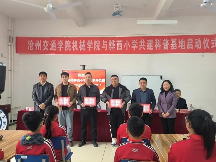 双方代表为共建科普基地签订协议书,标志着这一合作项目正式启动。骅西小学校长王普庆,副校长冯翠翠为sunbet官网机械与动力工程学院教学副院长代伟业、杨树岗老师、孙浩老师、李永越老师颁发科技辅导员聘书。