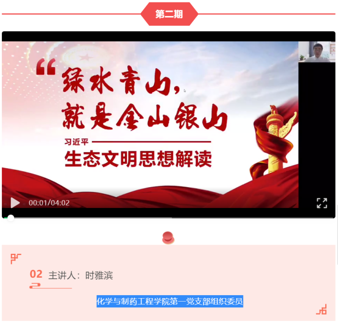 第二期微党课主讲人为化学与制药工程学院第一党支部组织委员时雅滨同志,主要内容为:习近平生态文明思想解读——“绿水青山就是金山银山”。