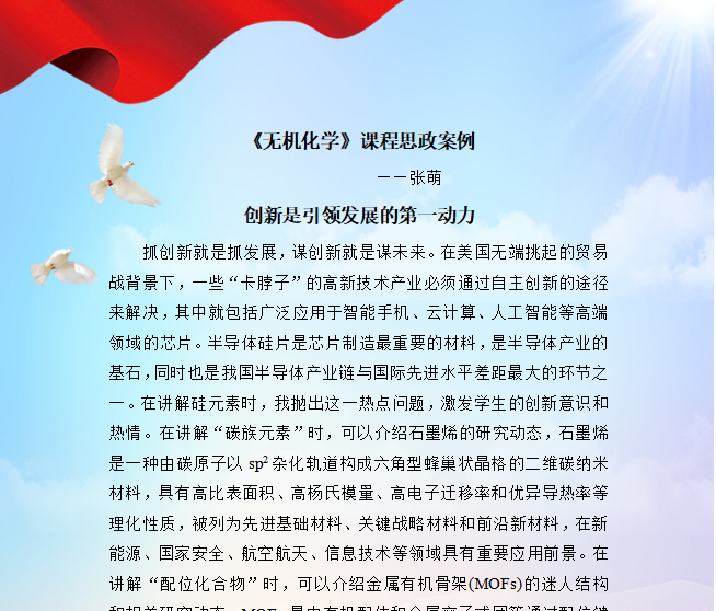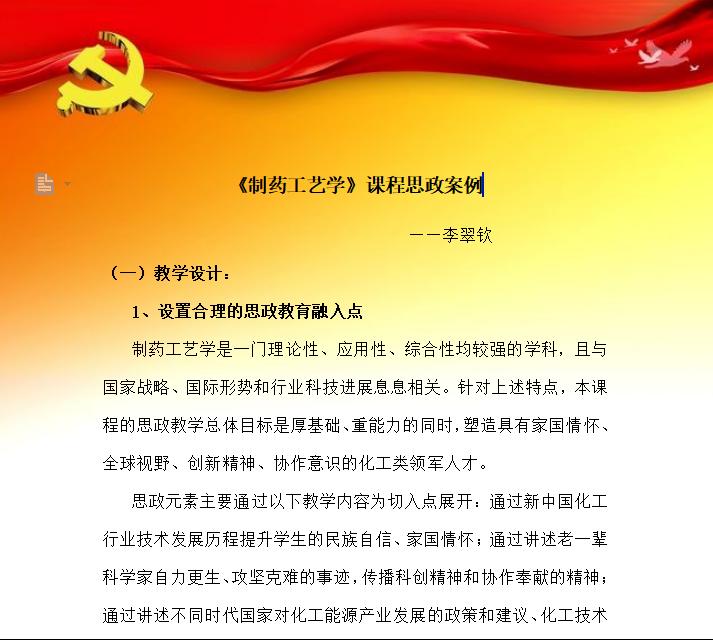 为深入学习宣传贯彻党的二十大精神,sunbet官网化学与制药工程学院第一党支部开展党的二十大精神进课堂活动,学院教师根据自己所教授的课程,结合党的二十大精神,设计教学思政案例,并运用到课堂实践中。该活动以丰富多样的形式,让党的二十大精神“热气腾腾”地走进校园,有机融入到课堂中。老师们在知识传授过程中将具体知识背后蕴含的科学观念、认知过程、科学精神以及科学家的家国情怀等内容自然地传递给学生,实现思想和价值的引领,达到立德树人的目的。