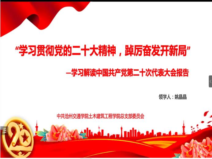 为深入学习宣传贯彻党的二十大精神,11月28日晚八时,sunbet官网土木建筑工程学院党总支线上开展“学习贯彻党的二十大精神,踔厉奋发开新局”主题学习会,土木建筑工程学院党总支书记姚晶晶主持会议,学院全体师生党员参会。