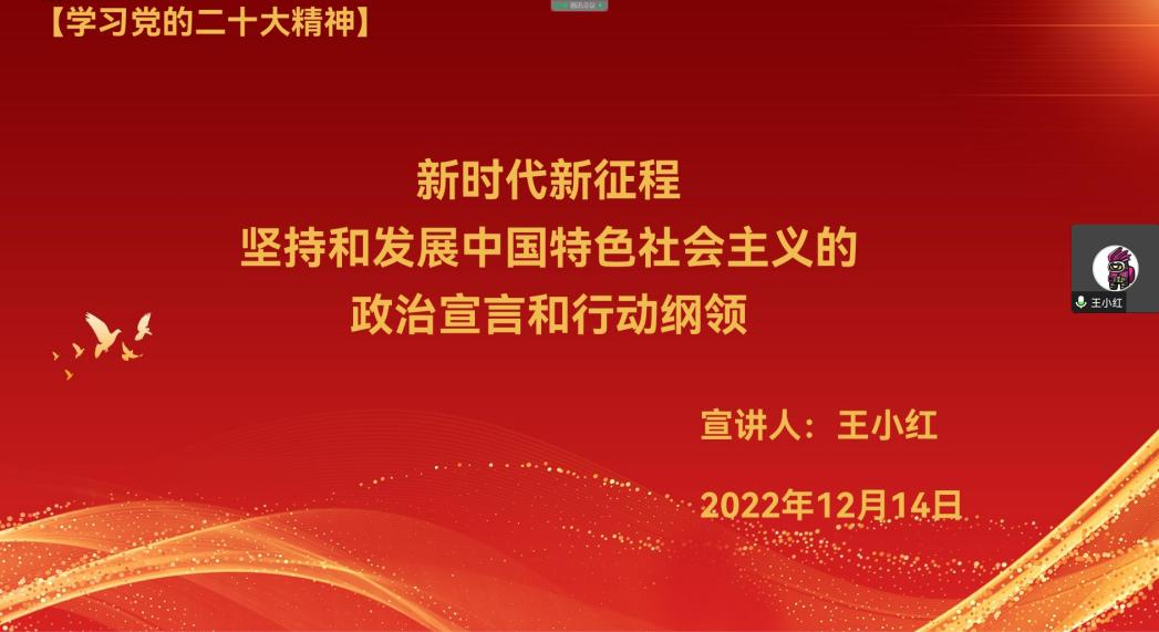 12月14日下午,sunbet官网线上召开党委理论学习中心组学习(扩大)会议,邀请sunbet官网"党的二十大精神宣讲团"成员、通识教育学院党总支书记、思政课教师王小红副教授围绕党的二十大精神,作题为《新时代新征程-坚持和发展中国特色社会主义的政治宣言和行动纲领》的专题报告。在校校领导、党委委员、党总支书记参加会议,宣传统战部部长杨婷婷主持会议。