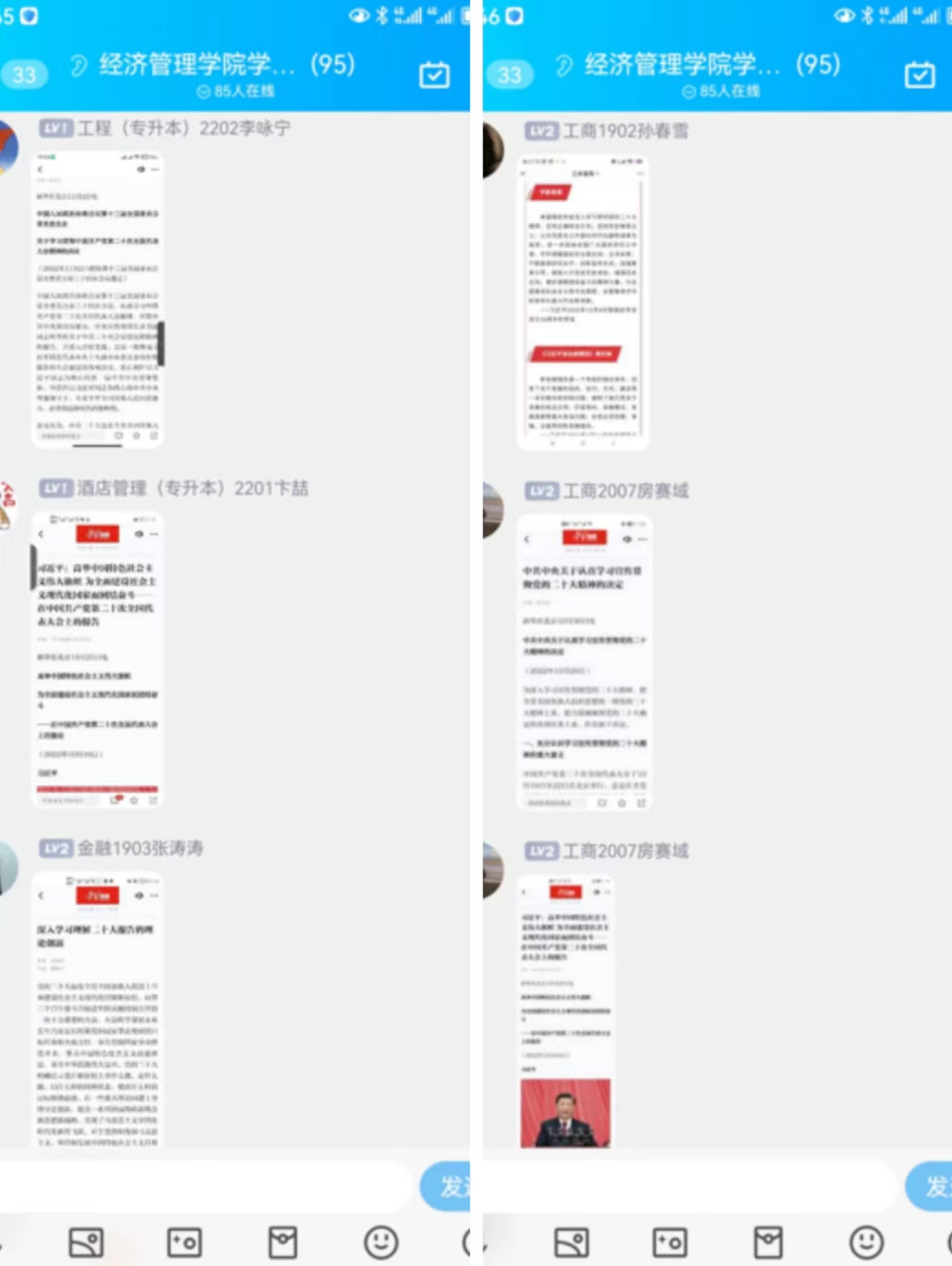 12月15日,经济管理学院第二党支部各学生党员以个人自学的方式,通过学习强国、微信公众号等平台学习了“推动中华民族伟大复兴号巨轮乘风破浪、扬帆远航——党的二十大报告诞生记”“二十大报告,习近平总书记强调‘三个务必’”“深入学习领会党的二十大精神”等文章,并在学习交流群中自觉打卡,并且积极讨论心得感悟,领悟党的二十大精神实质。